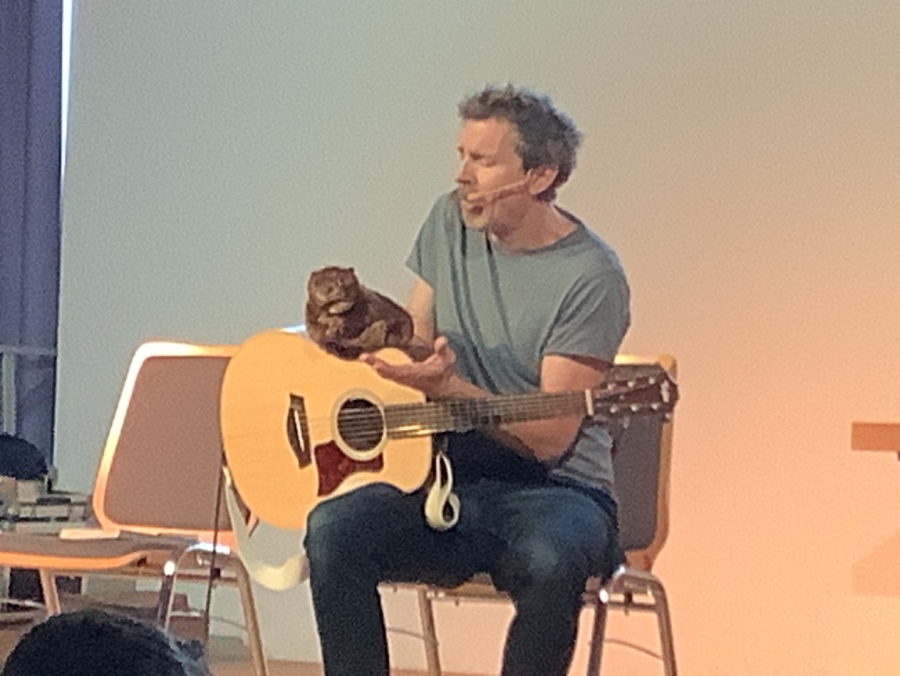 Dabei erzählte der gelernte Schauspieler frei, las vor, spielte Gitarre und nutzte außerdem noch eine Handpuppe, um seine Geschichte zu untermalen.