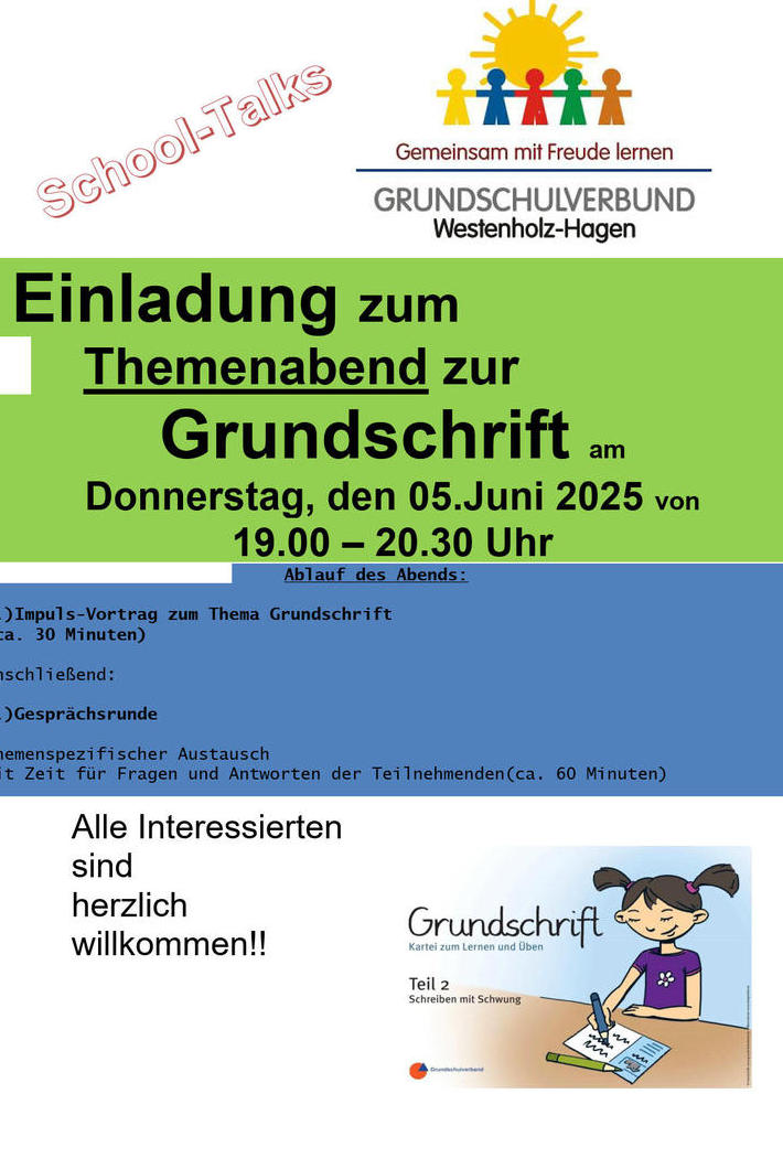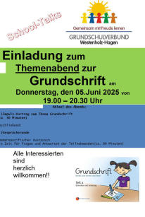 In regelmäßigen Abständen wird in den School-Talks die heutige Grund-schularbeit präsentiert, der Austausch zwischen Schule und Elternhaus angeregt, sowie das gegenseitige Verständnis der Situation von Eltern und Lehrkräften gesteigert.